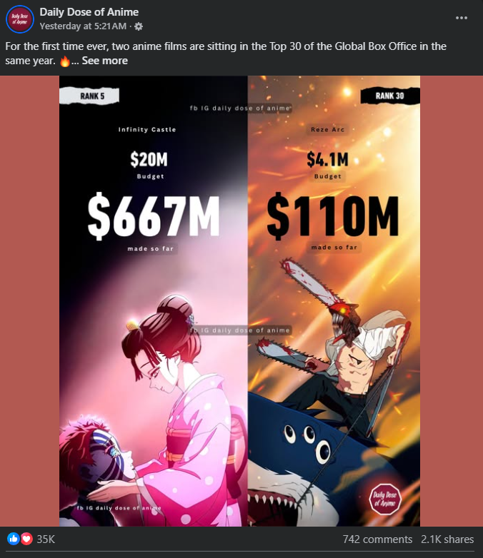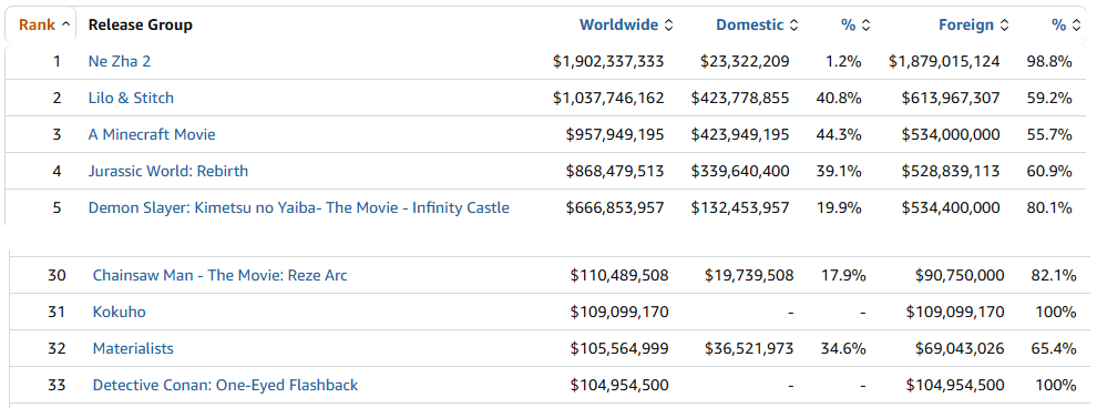 一方、『チェンソーマン レゼ篇』は30位に到達し、たった410万ドルの制作予算から1億1,000万ドルを稼いでいる。